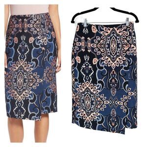 NWT Halogen Women's Brocade Lined Faux Wrap Pencil Skirt Metallic Navy Size 4