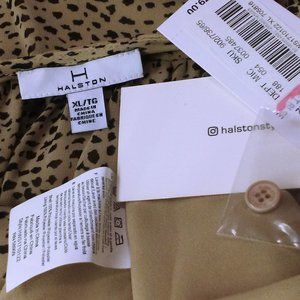 Deadstock New Old Stock (NOS) New With Tags (NWT) Halston Animal Print Romantic Poet Blouse BabyDoll Top, Ladies-XL (MSRP $79) Balloon Long SLeeves with ties cuff, Lined hidden button front, flowing gathered bodice, easy care polyester, in neutral Beige with black dots. In excellent pre-owned* New with Tags (NWT) condition with no visible flaws.