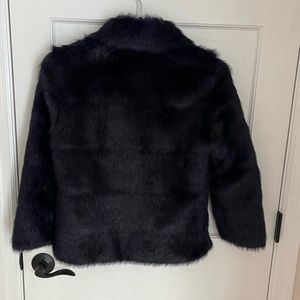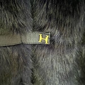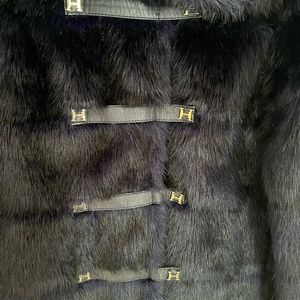 Here is a NWT Halston faux fur jacket in a size 8. The color is ultra marine which looks like a very deep purple and black. It has faux leather accents and gold tone hardware. It has 4 snap closures in the front which closes with the signature H and 2 regular snaps hidden under the collar. It is fully lined, has side pockets and a bracelet length sleeve.