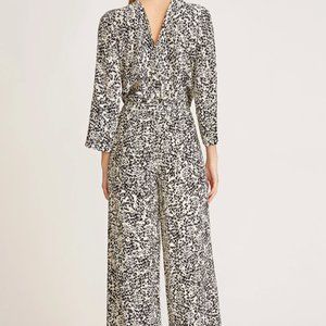 Pull on loose fit wide-leg silhouette with abstract polka dot-animal print pattern.