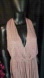 This is a stunning shimmering gown in dusty rose color. The gown is floor length. The front is a v-neck cut and the back has a plunging cut and ties around the neck. It's a little sexy and alot beautiful. The shimmer is so beautiful in the light. The gown has a flowy style.