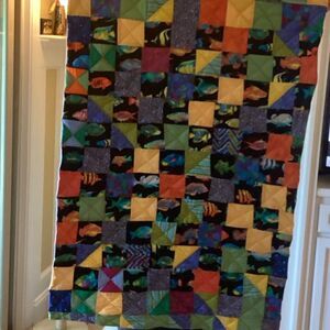 New with tags. Hand crafted from all new 100% cotton fabrics and made in a smoke free home. Gone Fishing has brightly colored fish swimming through bright prints and solids of coordinating colors all quilting with orange thread in a diagonal quilting pattern. Please zoom in to see the beauty of the fabrics in detail. Perfect size for a toddler or baby quilt, while it could also be a lap quilt for the fish lover! Measures 41” x 28 1/2”. Comes with care instructions.
