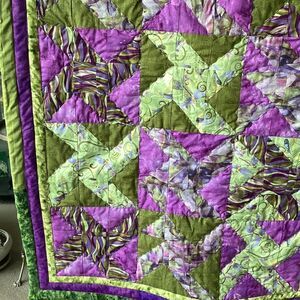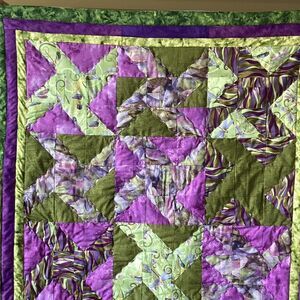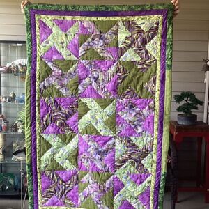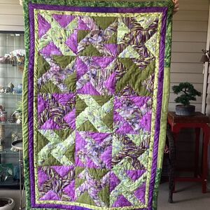 Add charm with this handcrafted quilt. Features intricate green and purple designs. Perfect for cozy decor. New with tags and hand crafted from all new 100% cotton fabrics in a smoke free home. Be sure to zoom in on the fabrics to pick up on all the golden touches in the beautiful fabrics. So much depth of colors that the camera can’t pick up on. A gorgeous collection centered around dragon flies at the pond. This lap quilt is perfect for snuggling or would also be fabulous as a runner at the foot of a bed. Backing fabrics are a collection of purples. Quilt features three borders.