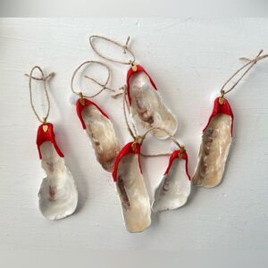 Hand-painted oyster shell Santa ornament measuring approximately 2" to 4" tall. Your ornaments will be one of a kind as each one is slightly different!