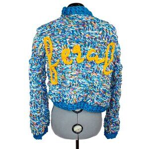 Handmade NWT crochet bomber style jacket/cardigan. This colorful, cropped crochet jacket features a textured basketweave stitch, creating an elevated quilted look that adds depth and dimension. The back features "FERAL" in vivid golden yellow, making a daring statement that’s impossible to ignore.