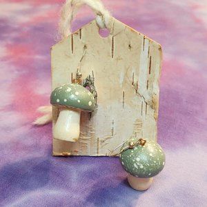 Never worn handmade mushroom earrings. Stems of the mushrooms are white, and the caps are a light sage green. Please keep in mind that the color you see may vary a bit due to each induvial screen settings. The mushrooms themselves measure just over 1" long and just under 1" wide... and they're very light. Earrings come as shown on the bark tag with yarn. I did *not* make these nor package them, but if you happen to know who did, please let me know so I can give them credit!