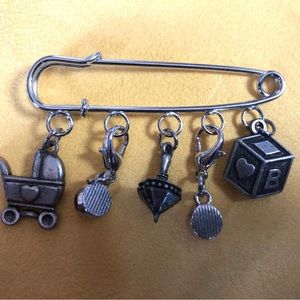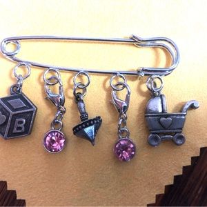Adorable handmade Baby Girl Pin. Silver pin with pewter baby charms & pink crystals