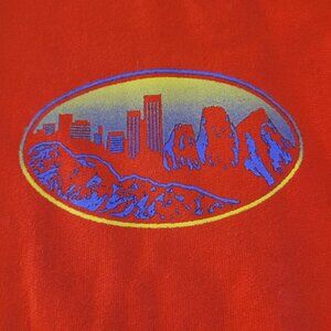 Hanes Explorer Men's French terry "Dyanmic Orange" hoodie with an ombre city / mountain design on the front