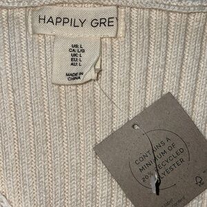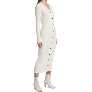 HAPPILY GREY Heavy Rib Knit Button Front Midi Dress Cardigan Style Ivory Size Large. Off White ribbed dress featuring stretch-design, ribbed knit, V-neck, front non functional button accents, long sleeves, straight hem and mid-length. Check out stock photos for inspiration fit and vibe. Brand new. Approximate measurements in photos.