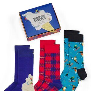 NWT Happy Socks 3 Pack Gift Set Assorted Snow Skiing Red Blue Plaid Sock Size 9-11 Shoe Size 5.5-9.5