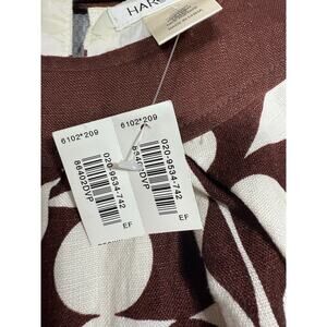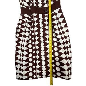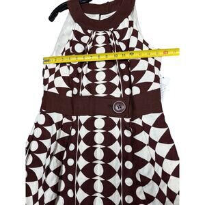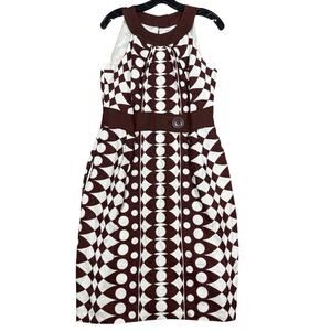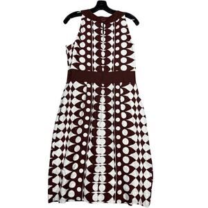 New with tags Harold’s sleeveless dress featuring a bold geometric circle and triangle pattern in rich chocolate brown and white. Made from 100% linen with a fully lined interior. Includes a flattering wide waistband with a decorative front button, back zip closure, and pleated front bodice for added shape.