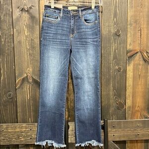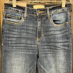 New with tags. Francesca's Harper Heritage brand Fray Hem Kick Crop jeans. Size 26. Medium denim. Super stretchy. Boho detail. Mid-rise. Flattering fit.