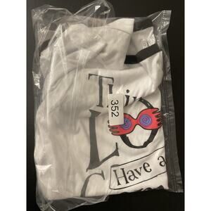 This NWT Harry Potter T-Shirt for women in size L features a white and black design with a graphic of the iconic character, Harry Potter. The shirt is made of cotton with a classic/fitted sleeve and a crew neck. It is suitable for casual occasions and has accents like sleeve stripes and a graphic print. The shirt is part of the Harry Potter brand, representing themes of magic, Hogwarts, and the Harry Potter movies. It is a basic style tee with a regular fit, perfect for any fan of the magical world created by J.K. Rowling.