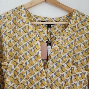 Beautiful Harve Benard Soft Texture blouse featuring a light yellow, gray/blue and white geometric design with metallic golden details.