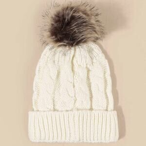 NWT White Cable Knit Beanie Hat with Faux Fur Pom Pom