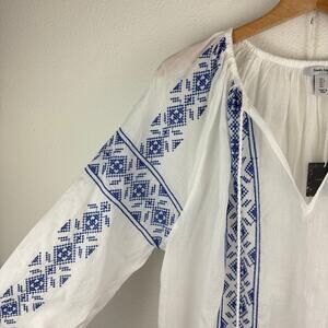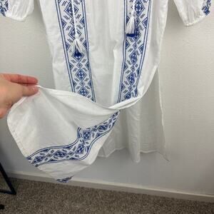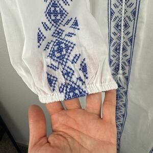 Lightweight cotton, white with blue embroidery, long sleeves with elastic cuffs, side slits, split v-neck with tassel ties, size large.