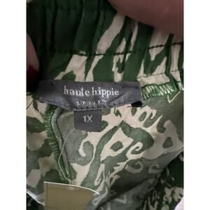 New with tags Haute Hippie size 1X wide leg pants. Elastic waist. Green and off white and some black around the bottom of pant legs. Waist is 16 1/2” across when not stretched at all and can stretch to 22”. Inseam is 27”.