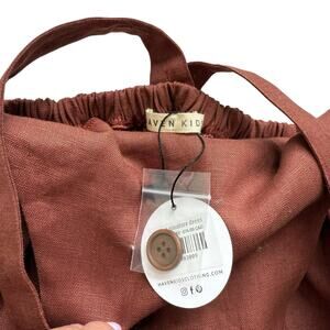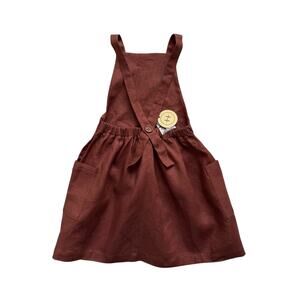 New with tags, Haven Kids cinnamon colored pinafore dress. Straps adjust with button on back. 100% linen. Made in Canada.