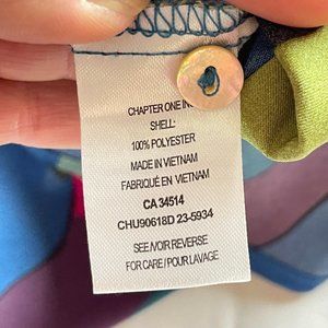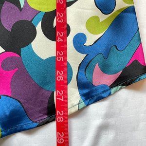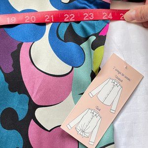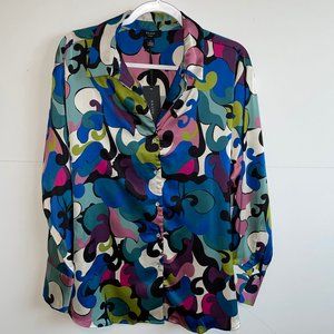 Brand new with tags! Wear two ways style, button down front satin blouse. Bold abstract paisley print, silky sheen fabric. Size L, measurements in photos.