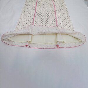 100% cotton fabric is so fine and delicate in a pale cream with swiss dots in varying shades of pink. Pink embroidered at the seams. Trumpet hem. So pretty and unusual. Fully lined.