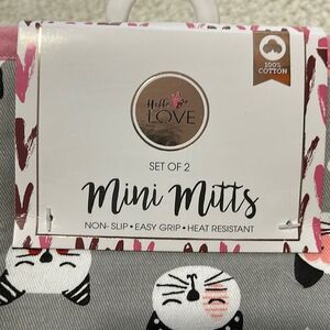 NWT- Hello Love. Three Kitchen Towels & a pair of mini oven mitts. Kitty Themed