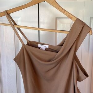 Whether you're dressing for a formal event or a night out, this blouse effortlessly transitions from day to night. The sleek camel hue and monochrome design make it versatile and timeless, while the asymmetrical silhouette adds a bold statement to your ensemble.