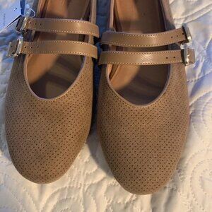 Sueded perforated fabric. Double straps with adjustable gold buckles. Memory foam footbed. Color is a neutral medium brown/taupe or chestnut. Perfect condition. New this season. Size 8.5