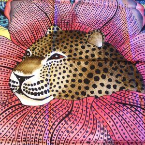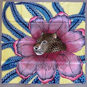 Beautiful NEW WITH TAG NWT Authentic HERMES Paris 100% Silk Carre 90 Twill Baobab Cat By Ardmore Artists Yellow Pink Blue Black Multicolor Square Scarf 90cm x 90cm/ 35" by 35". NO ORIGINAL BOX.