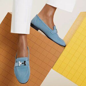NWT Hermes Moccasins Paris Velvet Loafers Light Blue Suede Goatskin Leather