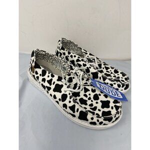 NWT Hey Dude Wendy Milky Way Black White Size 8 Cow Pattern Slip On