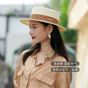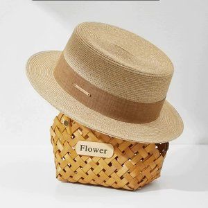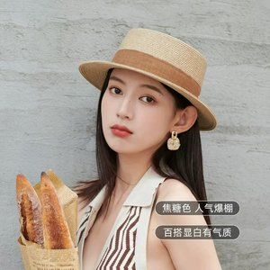 NWT Hi Crown Internet Celebrity Straw Hat For Women, Spring And Summer French Style Flat Top Hat, British Sunshade, Sun Protection, Seaside Outing, Showing A Small Face With Flat Brim Hat Size M