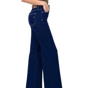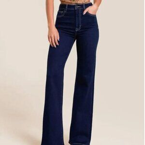 High rise Slightly fitted through the hip and thigh 19" flared bottom opening Color: blue