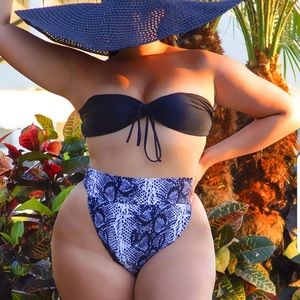 New high waist Matte Collection bikini. Black bandeau top with high waist snake print bottoms.