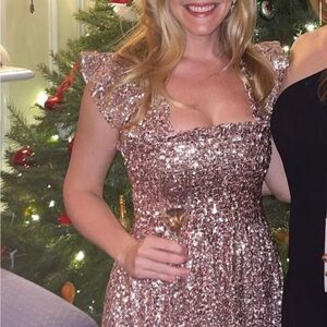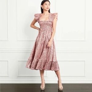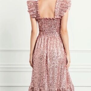 NWT Hill House Ellie Sequin Pink RoseGold Dress XS Step out in style with this elegant pink ruffle dress. Perfect for any occasion, this dress combines comfort and fashion effortlessly.