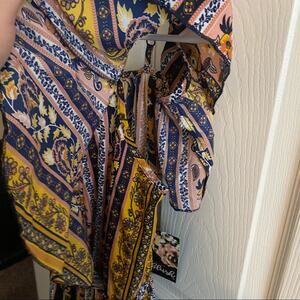 NWT Hint of Blush Asymmetrical Wrap Maxi Dress in women’s size small. Elastic waist w/ tassel tie. High low. Hi-low. Faux wrap shorter skirt in front & long in back. Off the shoulder. Adjustable spaghetti straps. Low cut, faux wrap look in front. New with tags. Blue. Blush pink. Mustard yellow. Floral & plant patterns. Whimsical, Cottagecore, bohemian. Pit to pit measures approx 16 in, elastic waist measures approx 11 in unstretched & length down center back measures approx 49 in.