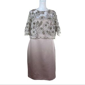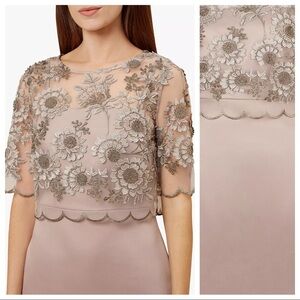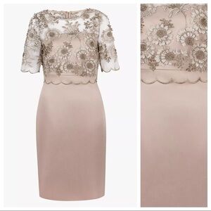 NWT. Hobbs Mink Anna Dress (stretch-satin) with a figure-skimming silhouette, crew neckline, a detachable lace top with elbow-length sleeves and scallop trims sits over the top, back zipper closure. Size 10. Size 10 - Pit to pit 19,5" flat, shoulders 15", sleeves 13", waist 16,5", length 40". BS