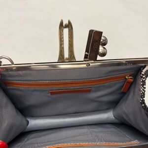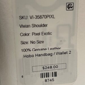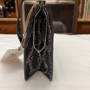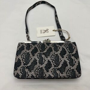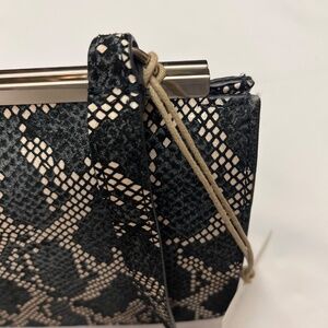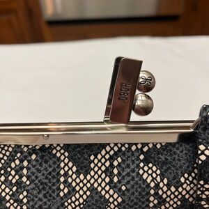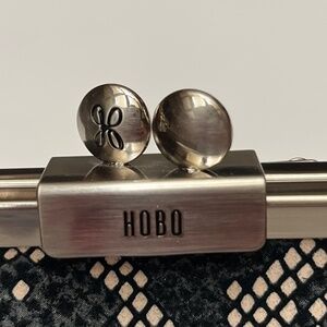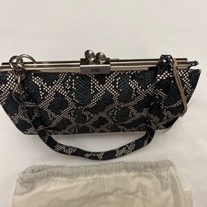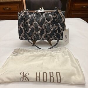 This is an adorable bag. It is smaller and is great for night/evening use or for day use when you want a smaller bag. It is a single strap bag with a 9” drop. It will fit over your shoulder so it is also great to throw in your suitcase for travel. There is a full size slide pocket on the back. It is a beautiful, exotic skin pattern in cream, dark navy blue and black so it gives you a lot of options. It works great for dressier evenings but also looks awesome with denim so it is very versatile. Top clip closure makes it secure . Silver hardware. The inside is lined with a grey blue grosgrain fabric. There is a long zip pocket on one side of the interior and a long slip pocket on the other side. It is plenty roomy for your cell phone and essentials. Original tag attached. Bag will come with its original stuffing and its dust bag. Extremely stylish and fun as well as eye catching and different. By HOBO. 9” wide. 6” tall. 2” deep. Bag snaps closed on top with a flip lock. New condition. Never carried. Due to downsizing I am selling some of my bags. Original price $248.00.