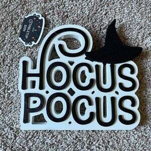 White & black painted wooden “Hocus Pocus” table top sign w/ black felt witch hat on top right & fun, whimsical font