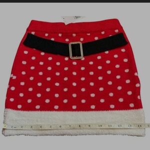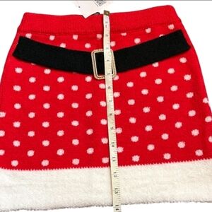 The NWT Holiday Knit Mini Skirt is a festive and whimsical addition to your wardrobe, perfect for the Christmas season. This red polka dot skirt features a Santa Claus character design, playful buckle accents, and a touch of sequins for added sparkle. Made from knit fabric, this short skirt offers a slight stretch for comfort and is perfect for a variety of holiday occasions, from casual to formal. Add a touch of holiday cheer to your outfit with this charming and versatile piece.