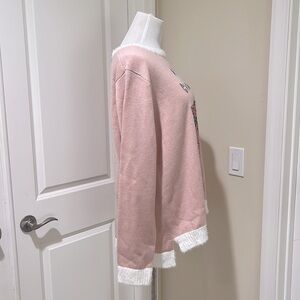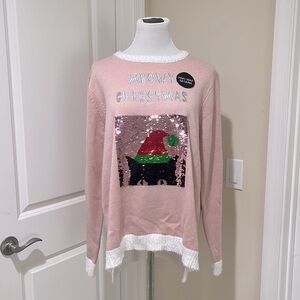 Holiday Time Sweater - "Meowy Christmas" - Scoop Neckline - Long Sleeves - Pink Wash with Fuzzy Material on White Hemlines - Interchangeable Sequin Design - Size XL - No Flaws - NWT
