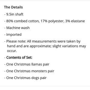 NWT Holiday Unisex Llamas, Weiner Dogs & Monsters Socks 3 pack Gift Box