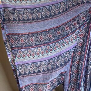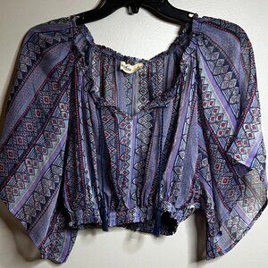 In excellent condition, new with tags! Elastic gathered neckline and hem. Cropped. Sheer fabric with allover geometric aztec print. Purple and blue, with navy tassels on neckline. Lightweight fabric. Wide, oversized sleeves.