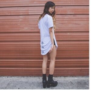 Love how versatile this brand new top is! You can wear as a dress, a tee, or layer it! The back has a unique LA design of triple layering (while still being light weight) and embroidered plus signs. Front is blank! The stock photos are not of this exact tee but are designed to give you ideas on how to wear this! The color you are getting is pink! It will come with original tags and the bag from online purchasing. The tees slits make incredibly cozy and comfy wearing and it is a lightweight tee. See all photos before buying and ask any questions below! I have a size small and a size large! The small pit to pit is 18” and length from shoulder to longest bottom 29.5”. The large is 21.5” without stretch and length shoulder to longest bottom hem is 32.5”.