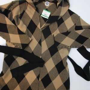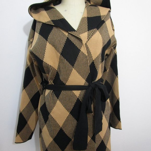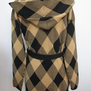 NWT Hooded Wrap Cardigan Sweater Diamond Plaid Check Camel Black