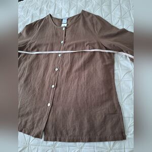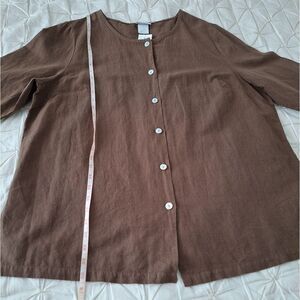 NWT Hot Cotton 1X, Brown tunic, top, blose, button down side slits, 3/4 sleeves, oversized, 50" chest, 30" long, cotton/linen, mother of pearl buttons, breezy, casual, Quiet Luxury, Resort Wear