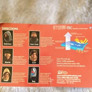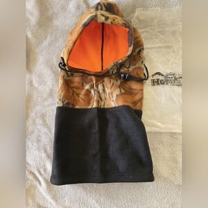 NEW WITH TAGS Hot Headz camouflage and black fleece hood with black drawstrings! Storm-Tec Weather Control Fabric! Windproof & Waterproof laminate! Water resistant surface sheds rain & snow! Great for hunters to add to add under safety coat! You can wear this 6 different ways; as hood, a balakclava, scarf, beanie, face mask, or bag!! See photos of examples of the different ways to wear! Very versatile hood!! ALL OFFERS CONSIDERED!