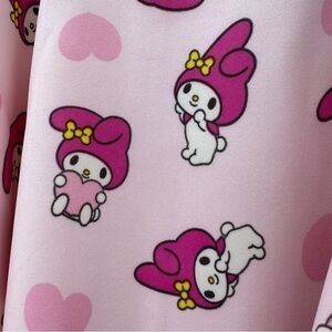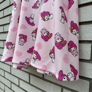 My Melody's here to make your outfit much sweeter! This scuba skirt features an allover print of My Melody in different poses, plus hearts all over. Comes with an elastic harness for a bit of edge, plus a back zipper. 95% polyester, 5% spandex.