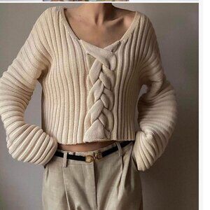 House of Dagmar's 'Sasha' is a cropped sweater made in a soft organic cotton rib with a beautiful hand knit cable at the front. Sleeves are wide and it has an open V-neckline. Style with a pair of denim or leather pants.