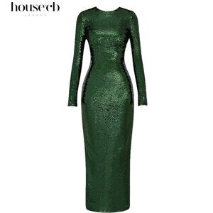 New with tags. House of CB ‘Belle’ maxi dress in pine green sequin with satin lining. Features open back, tailored fit, back zipper, and minimal stretch. Full-length design, approx. 61” long.