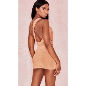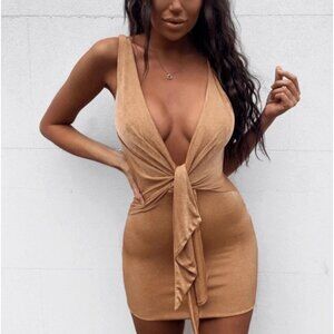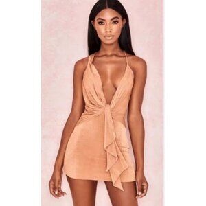 NWT House of CB Kiki Tan Mini Dress Plunge Deep V-Neck Ruffle Cocktail Large